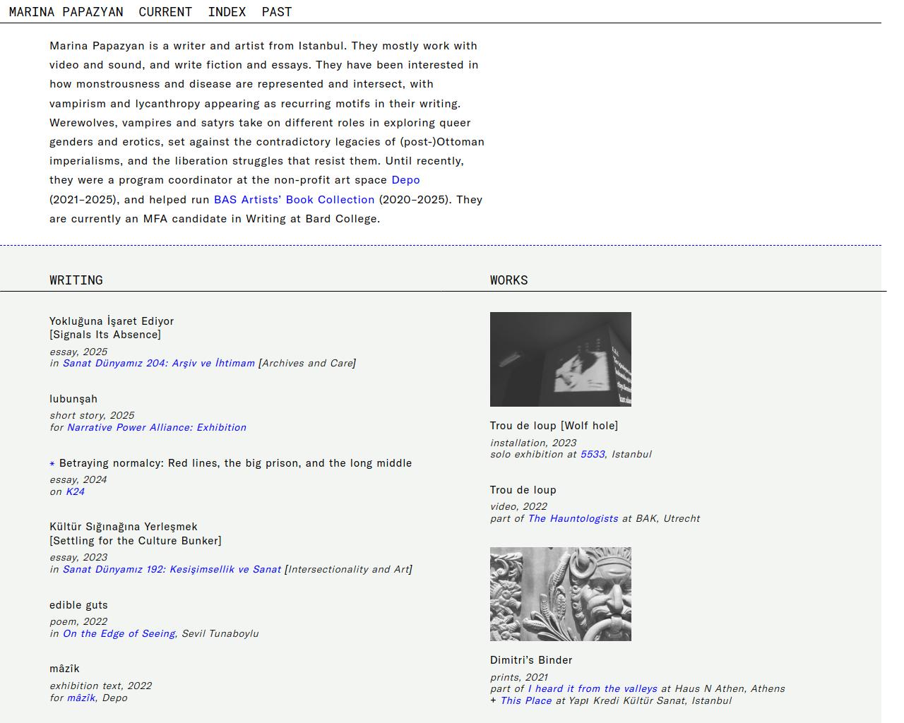 Works in the field(s) of: Art critique, Audio, Audiovisual, Programming, Text based, Web design, Writing, Artistic Research, Editing, Moderator, Visual art, Video / film (digital)